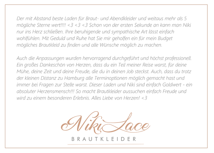 deine Hochzeit ist ein Tag, an dem alles perfekt sein soll – und das beginnt mit dem Kleid, das deine Persönlichkeit und deine Liebe widerspiegelt. Bei Niki Lace bieten wir dir